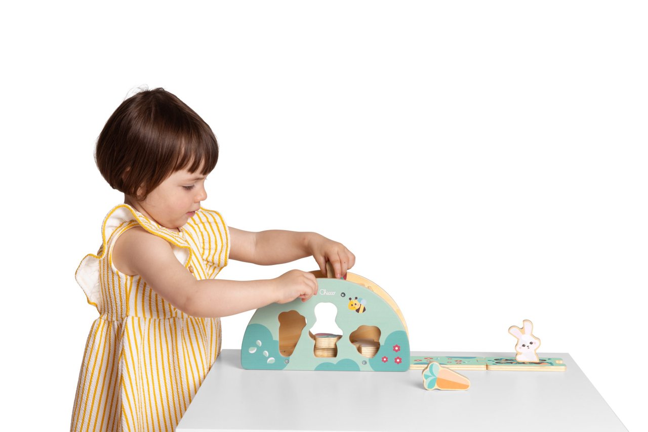 - Tante attività divertenti per imparare giocando: classificazione delle forme, gioco di equilibrio e tanto altro con 3 coniglietti esclusivi, 4 ortaggi per creare un piccolo orto e 2 pezzi di puzzle da incastrare.