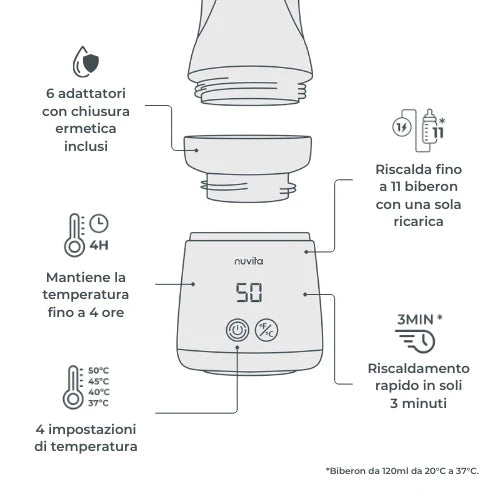 - Riscaldamento rapido in 3 minuti (biberon da 120ml da 20°C a 37°C).