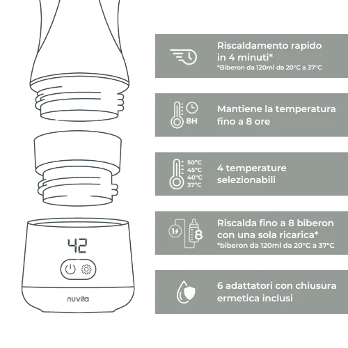 - Riscalda fino a 8 biberon con una sola ricarica (biberon da 120ml da 20°C a 37°C).